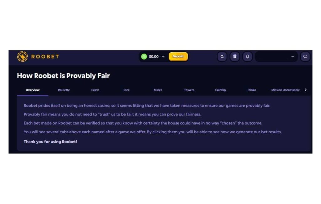 Roobet crypto casino commits to making its site trustworthy and transparent by using provably fair technology in its original games. Rather than leaving the way that games generate results hidden, Roobet gives players the ability to verify the results for themselves.